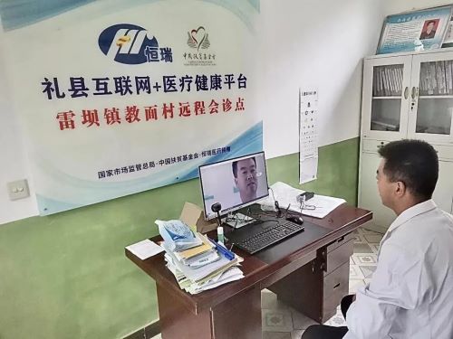 03礼县永坪镇镇中心卫生院利用“健康帮扶”项目平台进行问诊的医务人员和患者