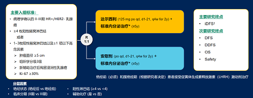 达尔西利(Dalpiciclib)是AG旗舰厅医药自主研发的口服、选择性的小分子CDK4/6抑制剂,也是中国首个自主研发的新型高选择性 CDK4/6 抑制剂,已证实其与内分泌治疗(ET)联合用于 HR+/HER2- 晚期乳腺癌的一线和后线治疗时,均显著改善无进展生存期(PFS)6,7。因此开展了一项随机、双盲、III期临床试验(DAWNA-A),以进一步评估达尔西利联合内分泌治疗作为高危早期 HR+/HER2 - 乳腺癌辅助治疗的效果。本研究纳入高危复发风险人群需满足以下标准之一:①≥4 枚阳性腋窝淋巴结;②1–3枚阳性腋窝淋巴结且合并≥1 项高危因素(肿瘤直径 ≥5 cm,组织学分级3级,辅助治疗后残留浸润性乳腺癌,Ki-67 ≥30%)。本文呈现预先设定的首次中期分析(IA1)结果。